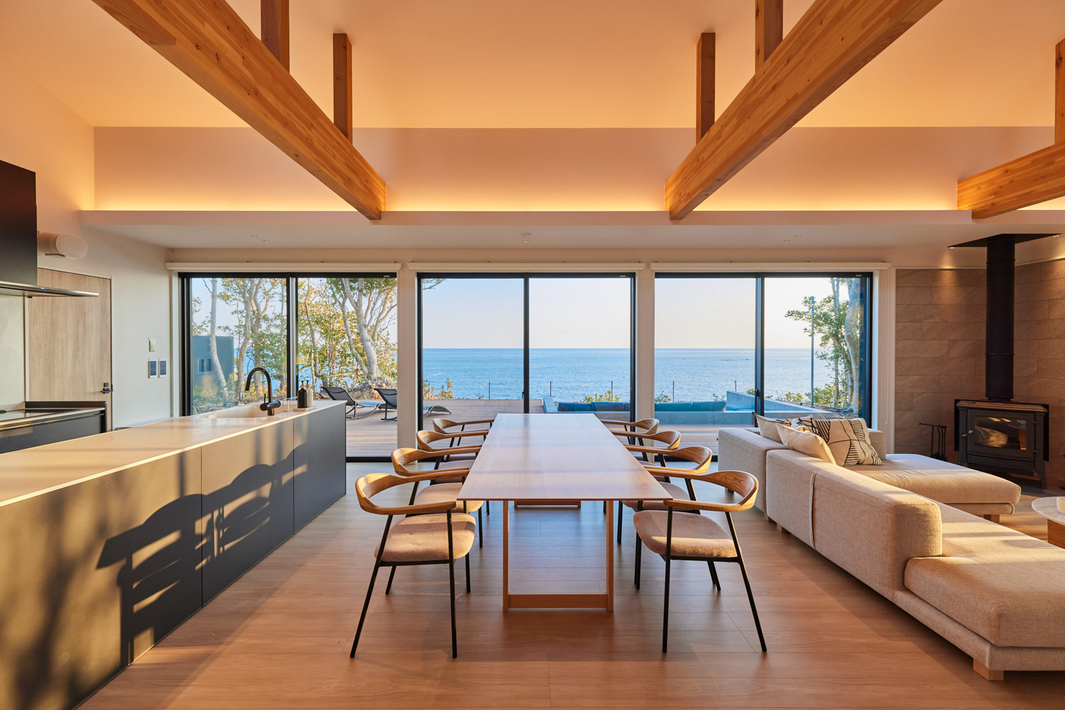 リビング・ダイニングには、大型ダイニングテーブルと薪ストーブを設置し、くつろぎのひとときを演出します。